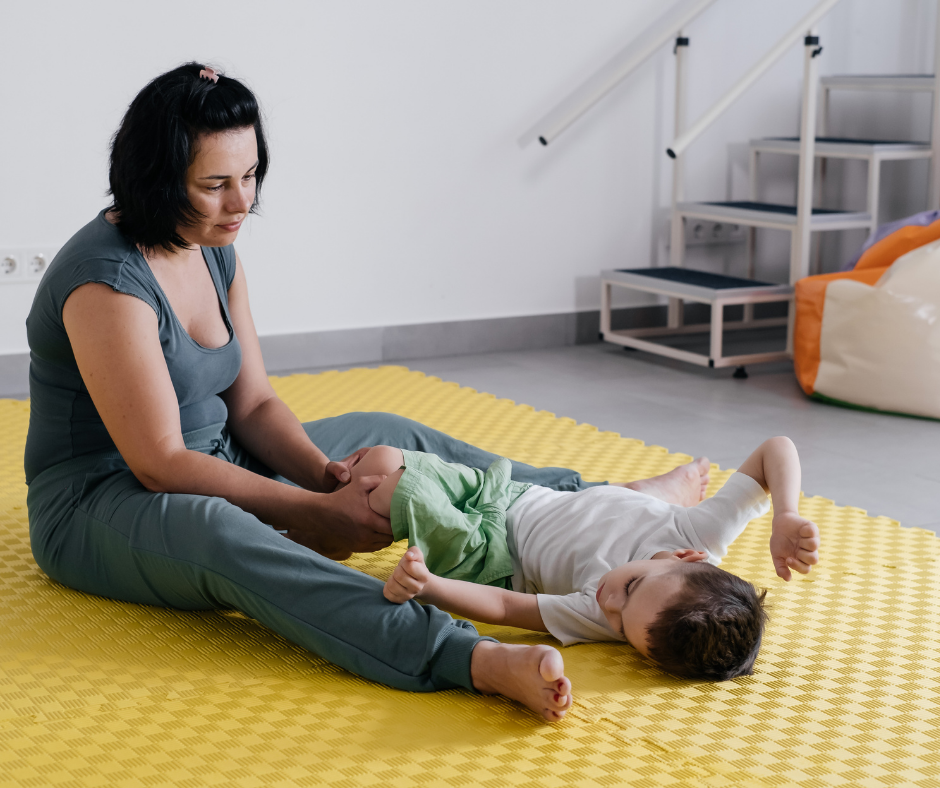 Have your child lie on their back with their leg straight. Use one of your hands to stabilize their heel and use your other hand to gently push their toes toward their shin. Hold for 30-60 seconds as tolerated on each leg. Your child should feel a “pulling” feeling in their calf muscle.