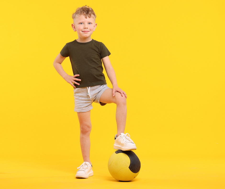 Keeping their toes straight ahead, have your child stand on one foot for 5-10 seconds. If they are unable to do this independently, have them balance their foot on a ball. Complete on both feet. Increase the time as they are able. If this is too easy, you can try standing on one foot on an unstable surface, like a pillow.